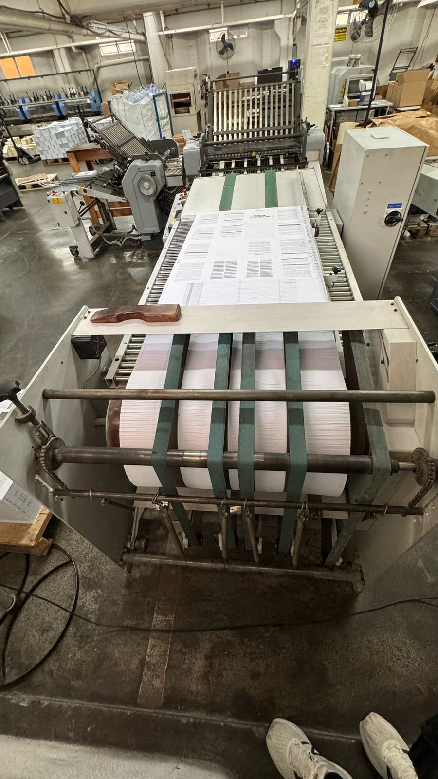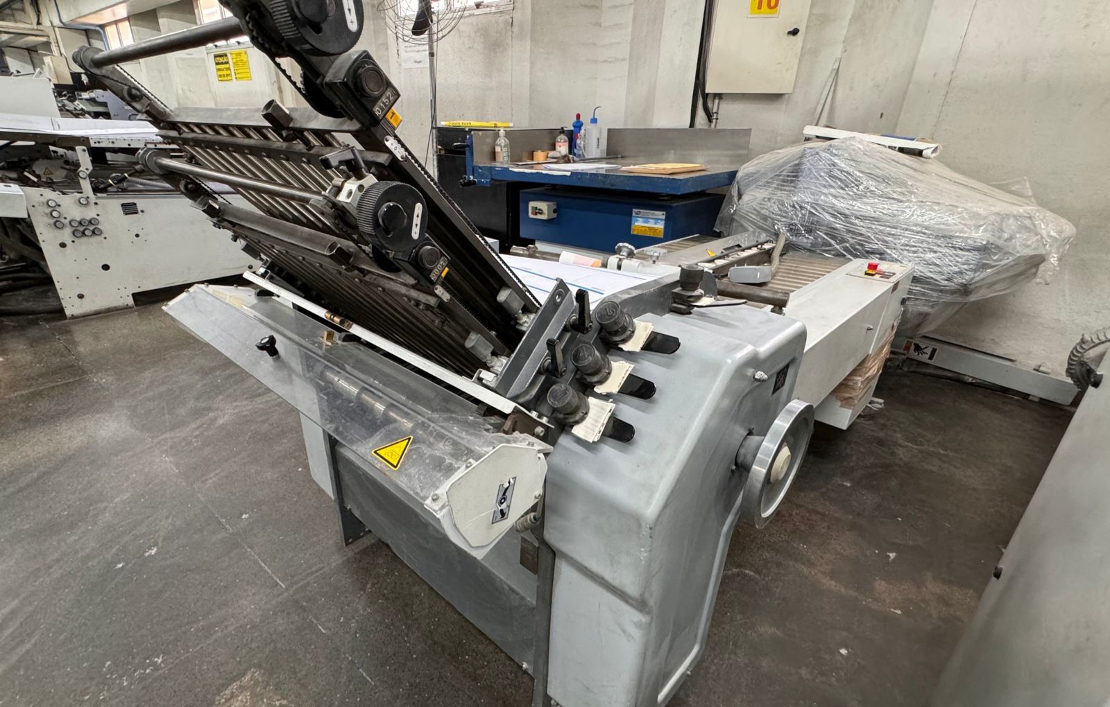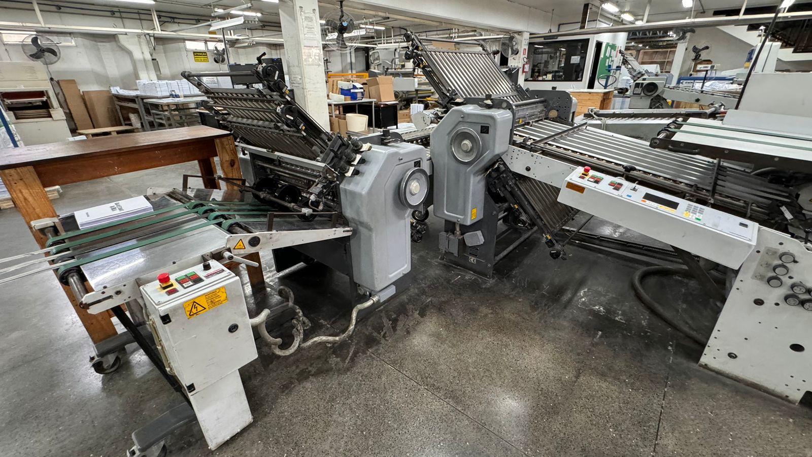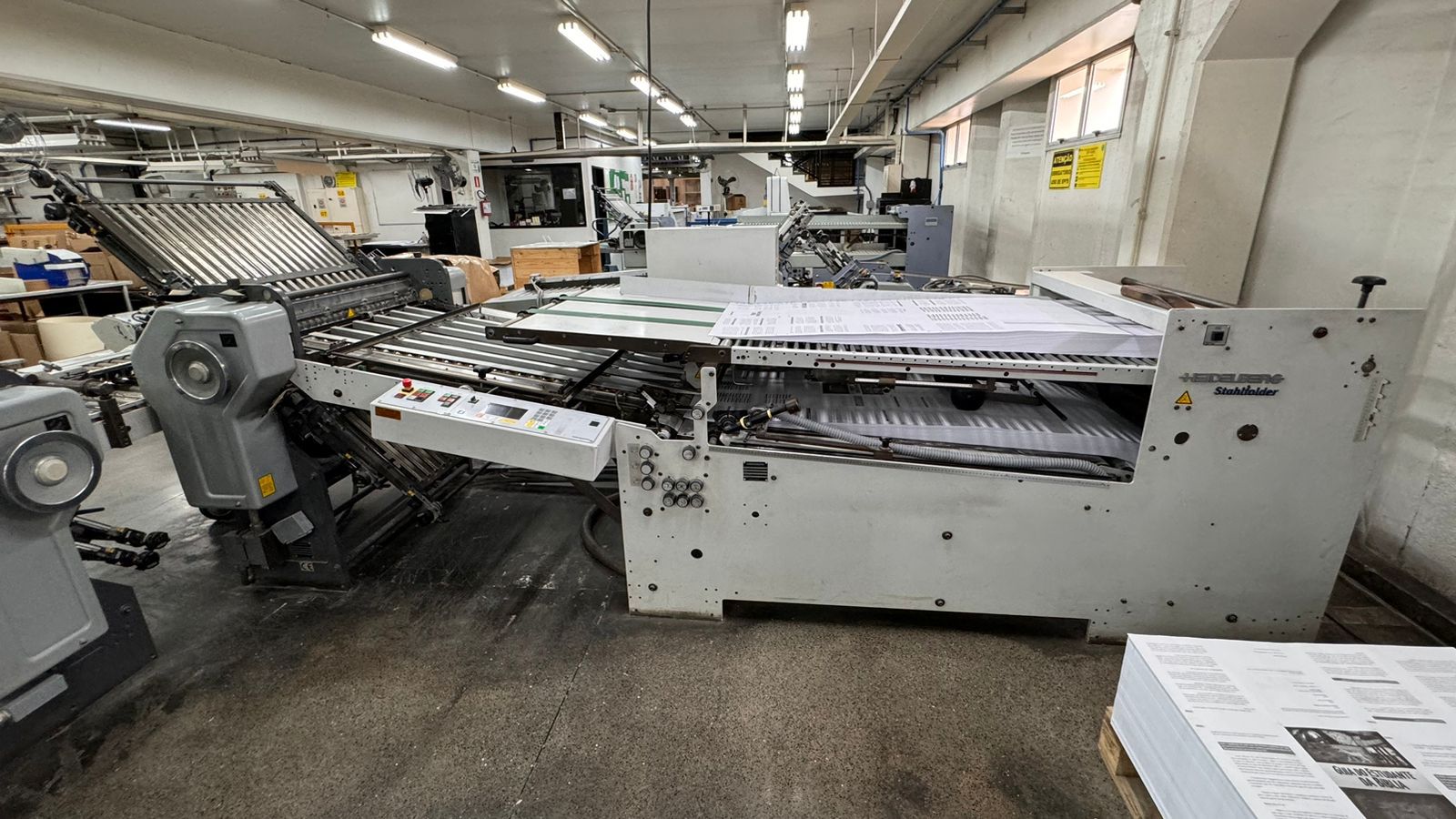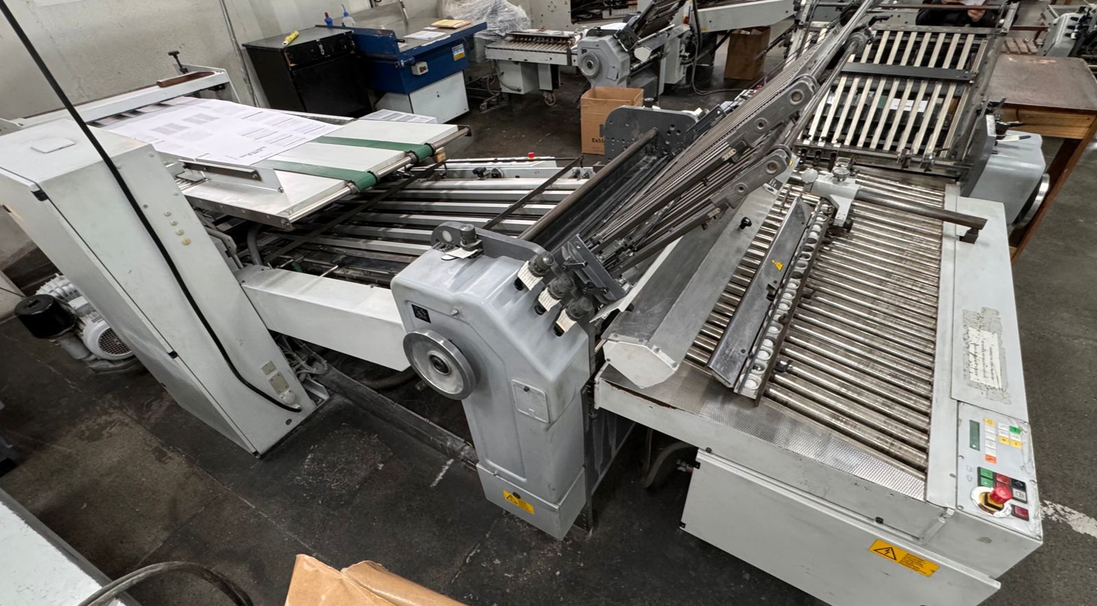 DOBRADEIRA HEIDELBERG STHALFOLDER – TD78-4-4-2 RD 2 – 78* – Número de série: FH.FAEA-00043, – Ano: 2002 – Velocidade: 7.900 ipm – Fabricação: Alemanha – Sistema de alimentação: Rotary, – Número de estágios: 3 estágios, mais mesa de saída – Composta pelas estações (12 bolsas) – 1ª estação de dobra com 04 bolsas – 2ª estação de dobra com 04 bolsas – 3ª estação de dobras com 02 bolsas – estação de faca móvel separada Stahl ano 1996 – 01estação de alimentação contínua – 01 saida em esteira – Voltagem: 220v – Quantidade de bolsas: 12 bolsas – Formato máximo da folha: 78×128 cm – Formato mínimo da folha: 15×18 cm – Comprimento mínimo da dobra: 5,5 cm – Comprimento máximo da dobra: 58 cm – Dispositivos: serrilha picote, disco de vinco e faca de corte do papel; – Detector de folha dupla – Ferramentas e manuais
