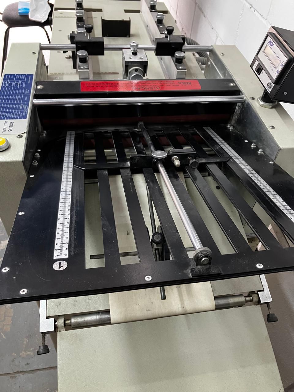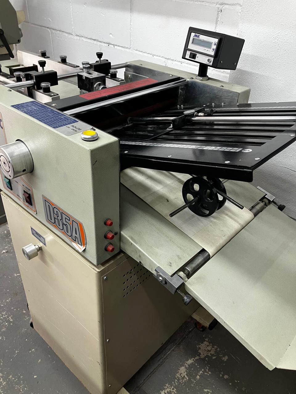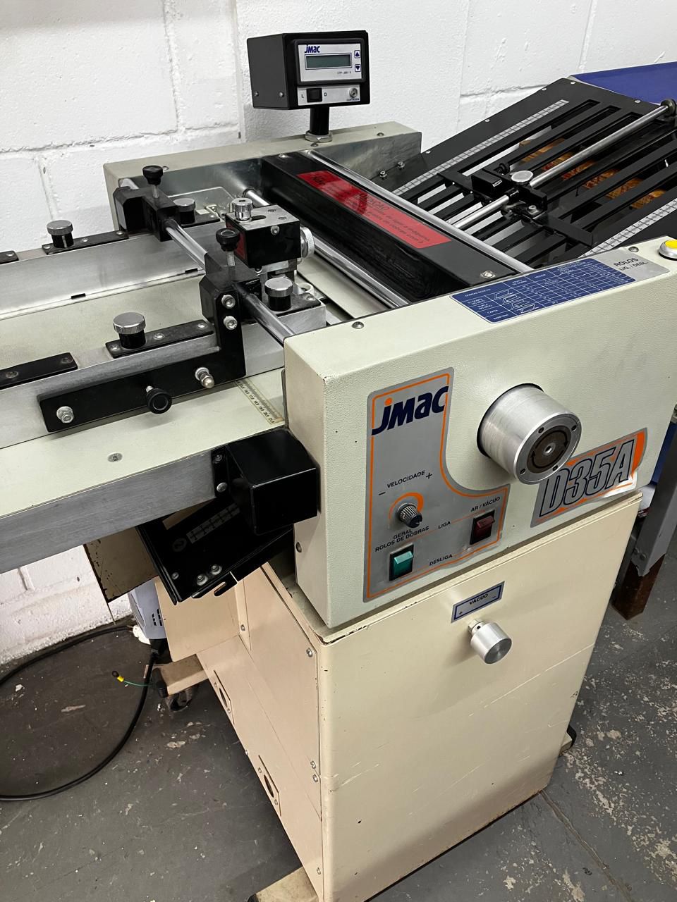 Dobradeira JMAC D35A. Descrição: Formato máximo: largura 35cm x comprimento 64cm Formato mínimo: largura 9cm x comprimento 12cm Velocidade: 23.000 fls hora Peso: 152kg