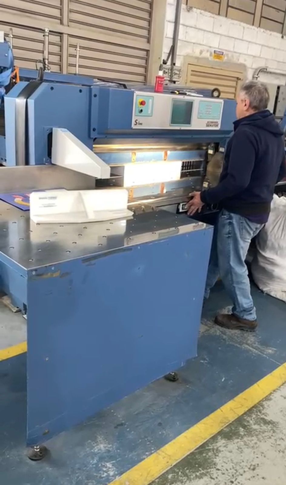 Guilhotina Schneider, modelo Senator Profile 1.37 de boca.* – Ano 2008. – 04 Facas novas com vídea no fio de corte. – Mesa vibradora com ar comprimido e inclinação 45 graus, para bater papel, com rodo de tirar o ar, mais rodo de transporte para a mesa lateral trazeira. – Mesa Traseira de transporte do papel para a mesa de corte (operação feita por trás da máquina). – Abertura da mesa de corte para caída do refile com 02 esteiras de transporte dos refiles. -Robô para empilhamento do papel cortado.