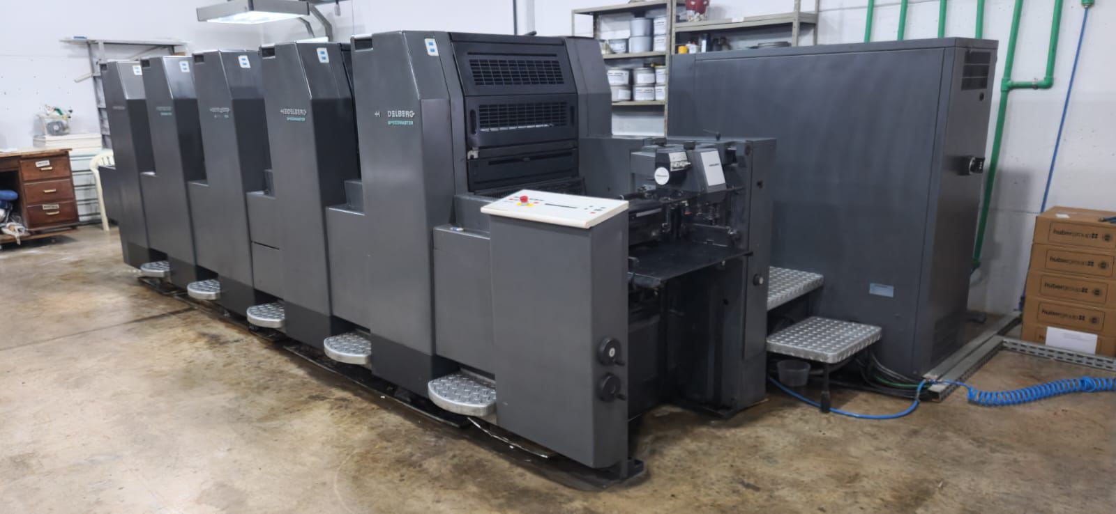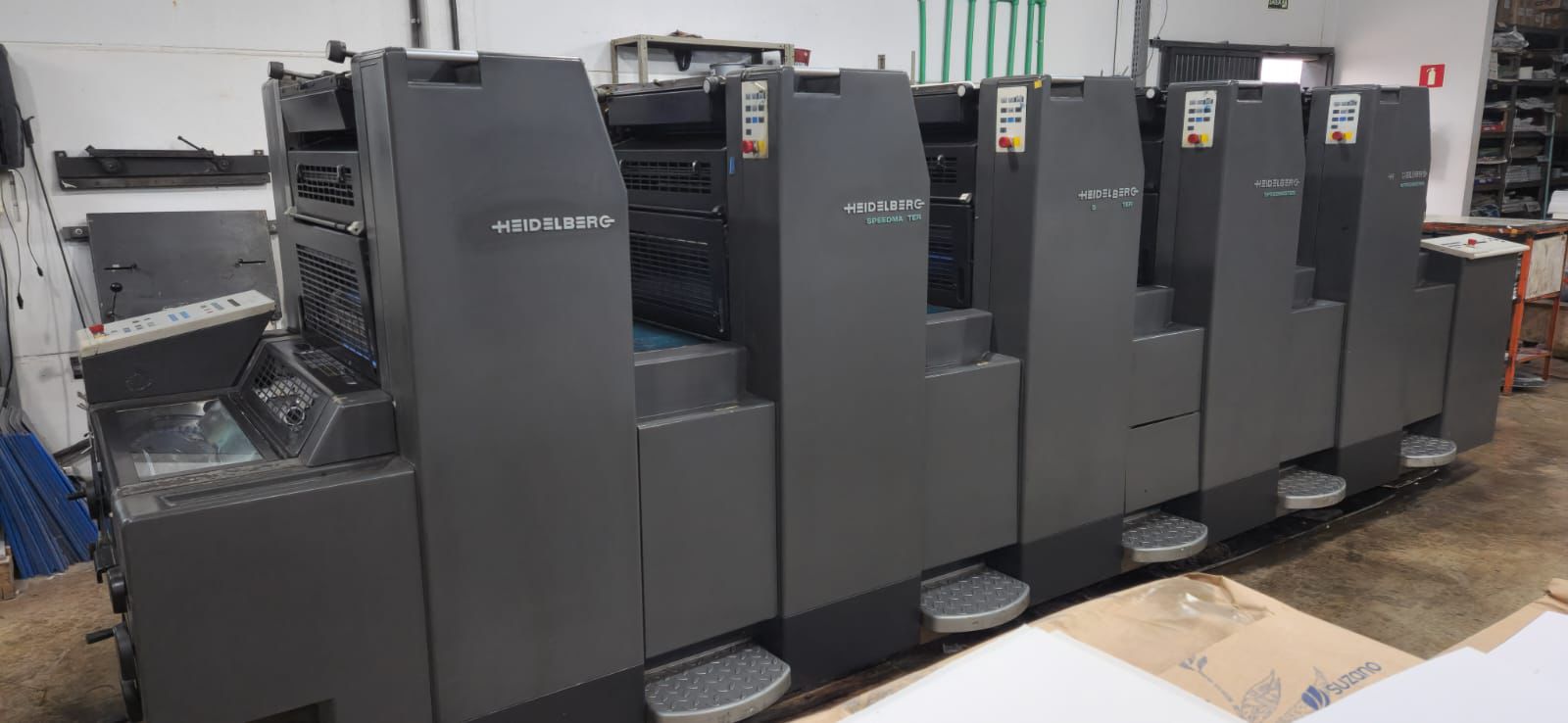 Heidelberg SM 52 5P3 5 cores Reversão 2 x 3 cores CPC 1.04 CPTRONIC Controle de tinteiros piano Registros circunferencial, lateral e diagonal de cilindros e chapas Sistema de molha alcolor Ano 1997 113 milhões de impressão 15 mil fls/hora Formato 52 x 37 cm Autoplate troca de chapa automática Espessura max papel: 0,5 mm Máquina em produção, disponível para qualquer teste