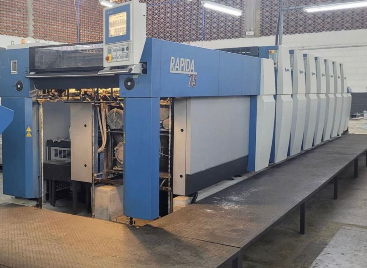 KBA RAPIDA 75-6+L ALV Ano: 2009 Console ErgoTronic com tela sensível ao toque TFT Unidade de amortecimento de acionamento diferencial Troca semiautomática de chapas Mesa de alimentação por correia de sucçãoAntiestática no alimentador Apoios laterais pneumáticos Detector ultrassônico Technotrans Alfa C Technotrans Alcocontrol Spray de pó Grafix Digital 3000 Unidade Lithocoat de revestimento Harris e Bruno Unidade de secagem Grafix IR/TL na entrega CIP3