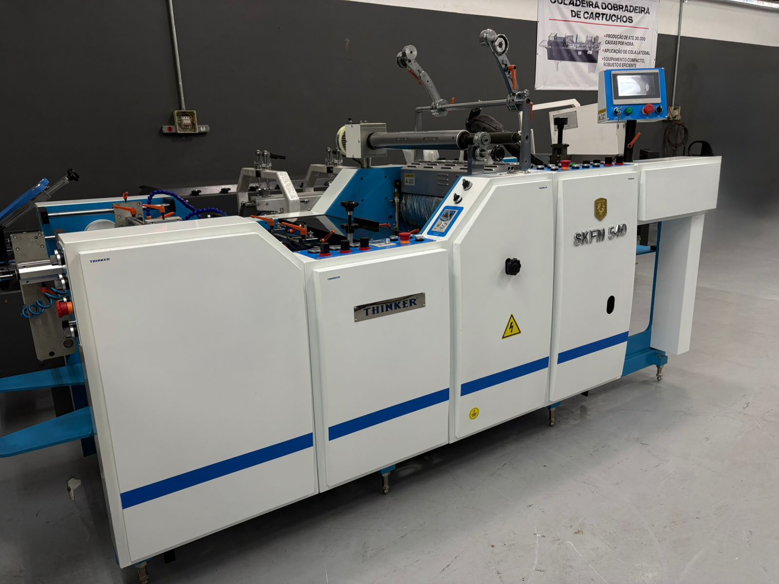 Laminadora automática Thinker SKFM 540 Formato Máx.: 540 x 750mm Formato Min.: 195 x 210mm Gramatura : De 105 ~ 500g/m2 Velocidade : 60 metros/min. Aquecimento por indução Tela touch Screen Alimentação automática Aparelho tremat Margeador Mesa de saída automática Destaque automático